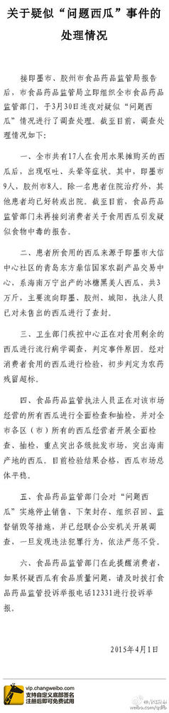 30日上午,即墨市食品药品监督管理局委托第三方检验检测机构对西瓜进行抽检,3月31日12时首批抽检检测报告已出具,检测结论合格,符合国家有关标准要求。目前,即墨市第二批“问题西瓜”及胶州市“问题西瓜”正在检测中,预计4月1日将出具检测结果。