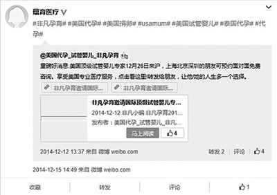 “今天又带一位代孕妈妈来医院检查了。”“今天又出生了一个健康的宝宝。”在营销代孕的微博账号“非凡孕育”的内容中,记者发现,微博运营者不仅在简介中提供了详细的网站地址、微信号、QQ号、咨询热线电话,还以每天少则一篇、多则四五篇的文字加图片形式频繁更新与代孕相关的状态及文章,其中不乏如何哄宝宝睡觉、与宝宝沟通感情的内容,让一位网友在留言中大呼“贴心”。