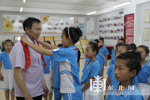 小学生为郑春生佩戴上红领巾。东北网记者王明菲摄